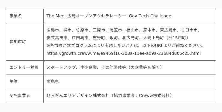 ひろぎんエリアデザイン株式会社(代表取締役社長 松内 紀子)では、広島県からの委託を受け、Creww株式会社(代表取締役 伊地知 天)とともに「The Meet 広島オープンアクセラレーター Gov-Tech-Challenge」を開催しています。