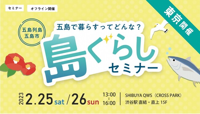 若者世代やファミリーの移住先に人気の五島市が、⾸都圏在住者に向けた特別なセミナー「島ぐらしセミナー」を渋谷駅直結「SHIBUYA QWS」で開催します!基本情報からネットには載っていない現地のリアルな情報が満載のセミナーは、五島市に移住したい方はもちろん離島へ移住希望の方も必見。