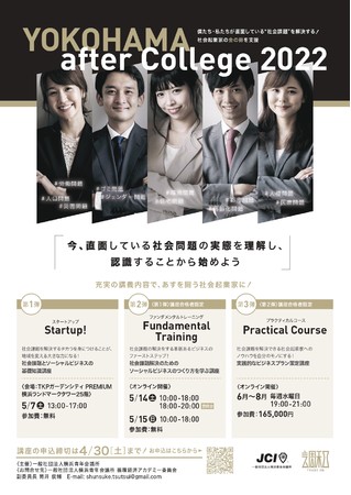 一般社団法人横浜青年会議所(所在地:横浜市中区山下町2 産業貿易センタービル3F 現理事長:崔成基)は、循環型経済を実践する社会起業家を横浜の街で育成していくための事業「YOKOHAMA after College 2022 Startup!!」を皮切りに『YOKOHAMA after College 2022』を開催いたします!!
