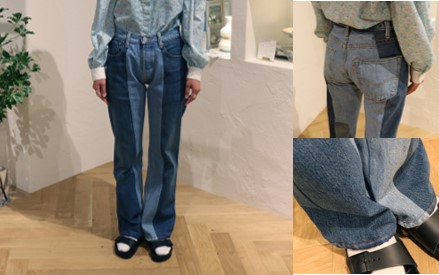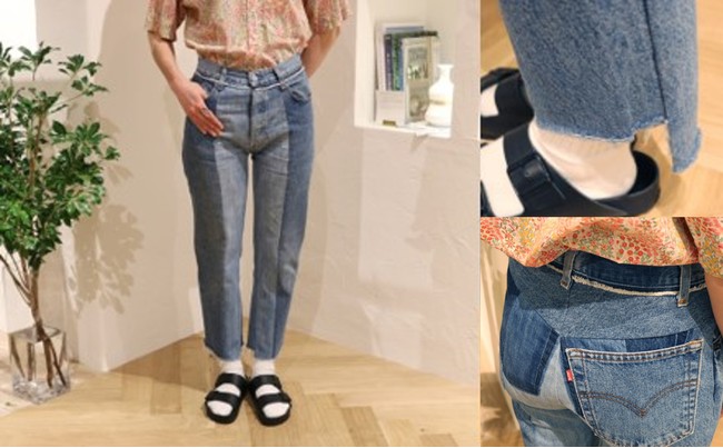 クロップト丈の切りっぱなしと配色デザインが足がきれいに見せてくれ、うしろのポケットもリメイクらしいこだわりのデザイン。