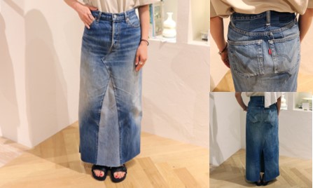 トレンドのタイトロングスカートは、色の濃淡のデザインをあえて依頼しています。きれいに履けるので、古着が得意でない方にもおすすめしたい一枚。