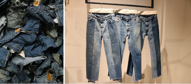 複数のデニムを繋ぎ合わせて仕上げる新しいデニムは、歴史を感じさせる経年変化によって生まれた自然な色落ちや風合い、そして味のある切り替えなどが特徴。それぞれに個性と魅力があり、世界で1本の「アップサイクルデニム」として生まれ変わります。