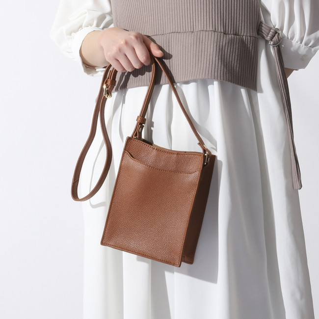 スマホやミニ財布、鍵など必要最小限の持ち物だけでお出かけしたい」そんな声から企画したスマホポーチです。二つ折り財布・スマホ・ハンカチ・ティッシュ・リップなど必要な荷物は十分入る容量があり、外側のポケットは、スマートフォンを入れたりとなにかと便利です。