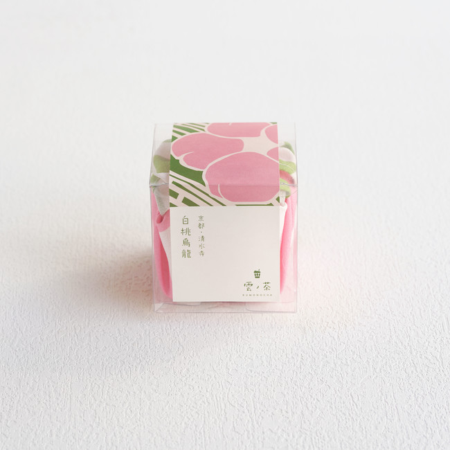 桃の色のように粉っぽい風呂敷に「桃がこころこ桜の坂道」と描かれてあり、一気に清水三年坂を連想させます、風呂敷の中は雲ノ茶が用意した極品白桃烏龍茶葉です。こもれ日の下で、上品な甘い香りに包まれるひとときを!