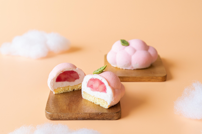 見た目も可愛いらしいピンクの雲、一気に桃を連想させるムースのふんわりとゼリーと桃の食感が楽しめ、柔らかな白桃ムース中を切り開くときれいなに桃の果肉を含んだサンドイッチ+となっており、桃の優しい甘さと烏龍茶の清らかな香り、どれもが互いの味を高め合います。