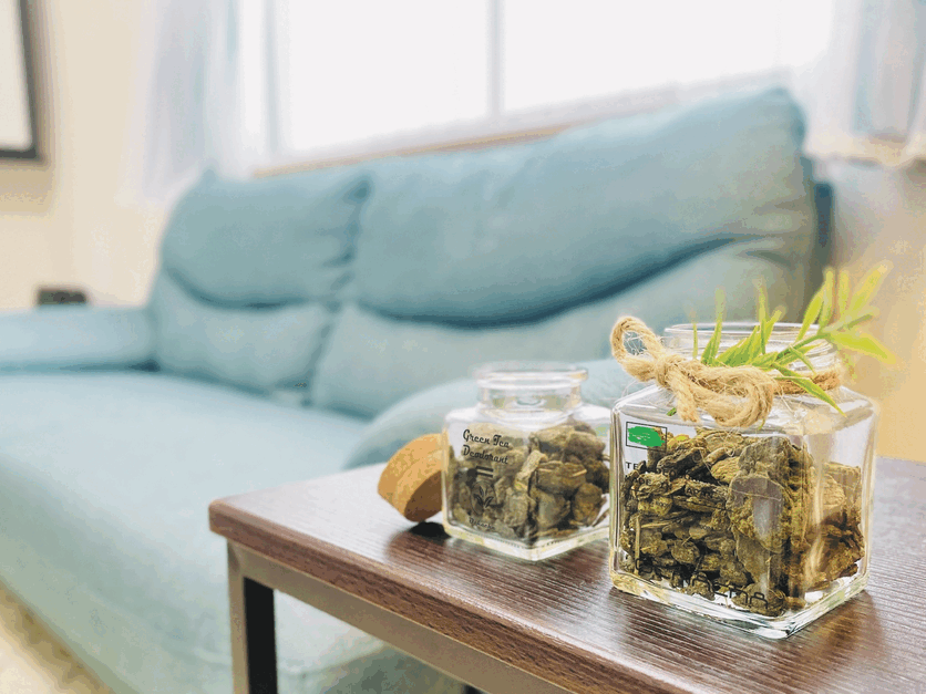 産業廃棄物として処理されている廃棄茶葉を再利用したサスティナブルな消臭材がお部屋の生活臭を消臭いたします。