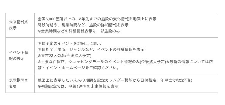 さらに3年先までの新店舗、新施設や街の再開発情報も表示されるため、街がこれからどのように変化していくのか事前に確認することが可能になります。