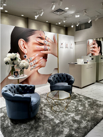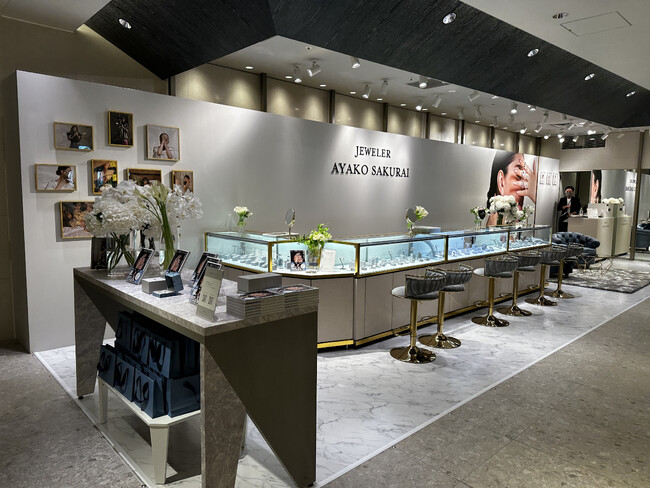 ジュエリーは、心ときめく空間でお選びいただきたいという思いで櫻井彩子がモデルとなり撮影したキービジュアルをメインとしたリラックスできる優雅な内装を設営。
