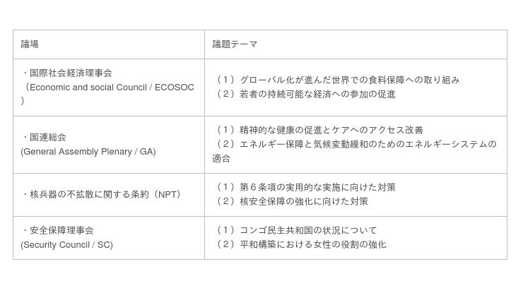 模擬国連世界大会では、参加する学生は4つの議場に分かれて議論を行います。各議場では事前に2つのテーマが設定され、大会当日に議論するテーマを1つ決定します。議題のテーマは学生たちが「平和」に焦点を当て、国際課題や社会情勢を踏まえ、決定しています。