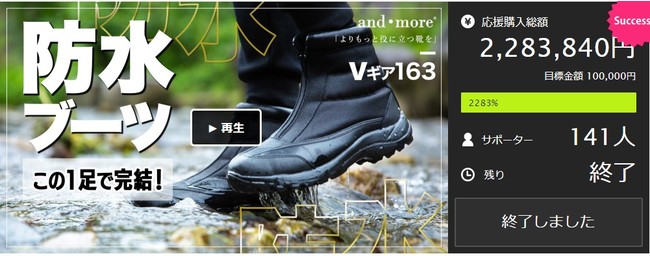 応援購入サイト(Makuake)で220万円以上の支援金額達成の防水ブーツ『Vギア163』CAMPFIREに挑戦!