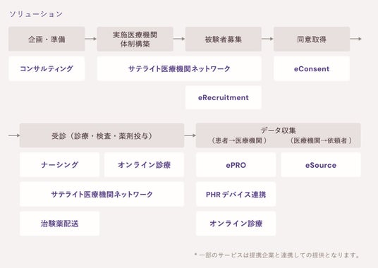 - DCTソリューションの中でも、医療機関ネットワークを活用した被験者リクルーティング、患者の来院に依存しないフレキシブルなビジットの設計・運用に強みを持つ。フレキシブルビジットについては、全国をカバーする自社登録看護師ネットワークによるホームナーシング、サテライト医療機関による診療・検査等体制の構築、またグループ企業である株式会社インテグリティ・ヘルスケアによるオンライン診療体制の構築などにより、プロジェクトに最適な設計を図る。