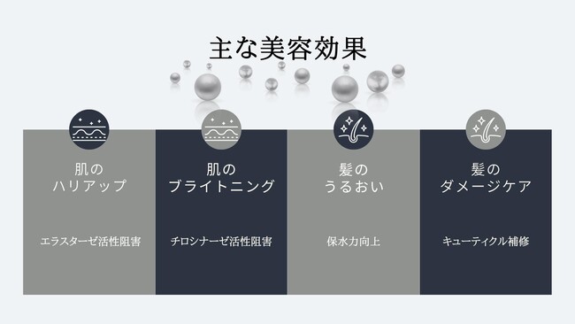 BLACK PEARL Extract™は、スキンケア効果とヘアケア効果の両方が確認されている美容成分です。スキンケア効果として、肌のハリ低下に関与するエラスターゼ活性阻害、シミの生成に関与するチロシナーゼ活性阻害を、ヘアケア効果として、髪の保水力向上と、髪の表面のキューティクル補修によるダメージケア効果を確認しております。