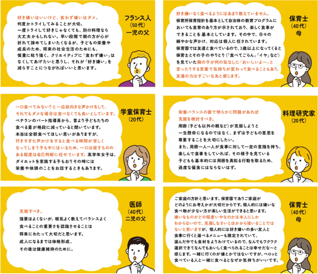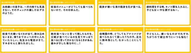 さらに、子どもに対する「好き嫌いエピソード」を調査でヒアリング。「給食のメニューがどうしても食べられないのでその日は休んだ」「子ども3人嫌いなものがそれぞれ違うので献立作りにいつも悩む!」など様々な親の家庭の実体験に基づいたエピソードがありました。