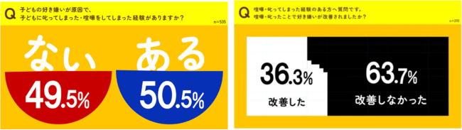 TOPIC2.:好き嫌いがある子どもと親の経験や抱える悩みを調査 子どもの好き嫌いで・・・半数の親が「叱った・喧嘩をした」、しかし「改善しなかった」が6割以上