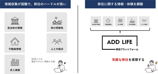 ADD LIFEは地域の情報を1つのWEBサイトに集約するため、これまでの移住ハードルを下げます。加えて気軽に始めることができるサービスのため、まず実際に住んでみて、自分に合う地域なのかを実感することができます。