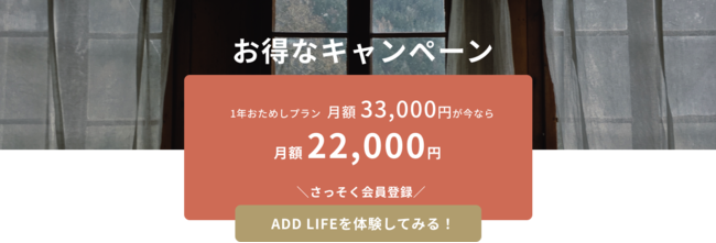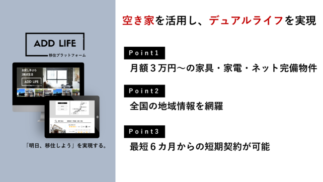 ADD LIFEでは全国の家具・家電・ネットを備えた空き家を探すことができ、短期間から無理のない金額での2拠点生活(デュアルライフ)を実現するWEBサービスです。