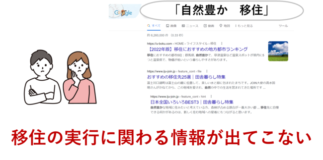移住希望者が希望条件(自然が豊かなど)で移住地を探したいときには情報はまとまっている場所はありません。現在は各地域が自分の地域のことを発信している状況のため、情報が散乱しています。