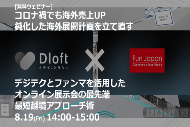 DX推進支援事業を行う株式会社デロフト(東京都渋谷区、代表取締役岸本誠)は、2022年8月19日(金)に株式会社Fun Japan Communicationsとの共催ウェビナー『コロナ禍でも海外売上UP!鈍化した海外展開計画を立て直す、デジテクとファンマを活用したオンライン展示会の最先端!最短越境アプローチ術』を開催することとなりましたのでご案内いたします。