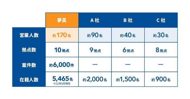 新規企業営業と既存企業営業のW体制を実行するには、多くの営業人員が必要です。試験導入からたった9ヵ月で本格導入できたのは、夢真の営業人数が同業他社よりも圧倒的に多かったからです。他社よりも圧倒的に多い営業人数・営業拠点を設けている夢真だからこそ実現できるのです。