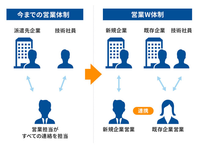 この体制により新規企業営業は企業の新規開拓に専念できるようになり、今まで以上に積極的な営業が可能になりました。また、既存企業営業は定期的に現場を訪問することで、早い段階で小さな課題をキャッチアップできるようになりました。そして、既存のお取引先企業様・技術社員双方にとって今まで以上に働きやすい環境を整えられるようになりました。