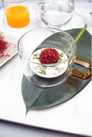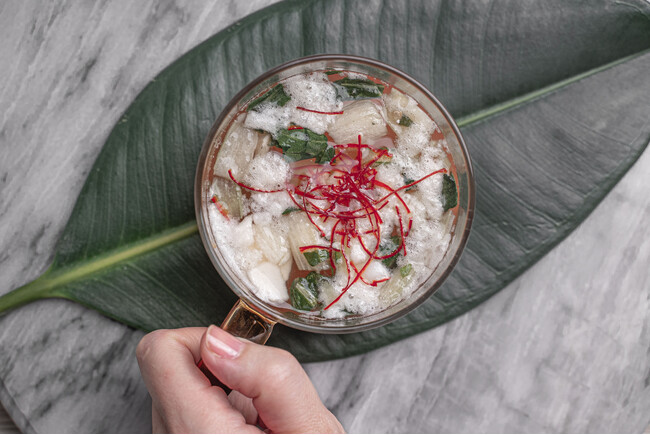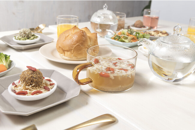 石川県の加賀みそに天然のどぐろだしとコチュジャンをブレンド、糸唐辛子をトッピングし、具材には薬膳食材の白木耳と、シャキシャキ食感にほのかな甘味感じる青梗菜をチョイスしました。インパクト大ですが、糸唐辛子の辛さは控えめで深いコクを味わえる韓国風ピリ辛スープ。