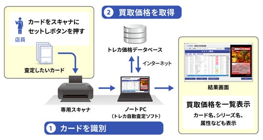 トレカビジネスを強力に支援することを目的とした、自動査定システムです。スキャナで読み込んだトレーディングカードを画像処理により判別し、インターネット上に構築した価格データベースから買取価格を取得します。価格データベースは週2回の頻度で最新価格に更新されます。「ピタカ」はカード100枚を3分45秒で読み取ることができ、99%以上の精度(出荷前テスト時)で判別可能です。「ピタカ」の導入により、簡単に素早く正確な買取作業が行えるようになります。