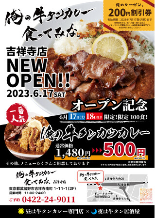 「俺の牛タンカレー食ってみな。」および「本格牛タン居酒屋 牛タン番長」ではこの度の店舗オープンを記念して通常1480円の牛タンカツカレーを特別価格500円にて6月17日(土)18日(日)の2日間限定で販売いたします。