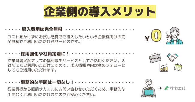 企業は「サカエル」を導入いただくことで、費用や人的リソースを一切負担することなく、従業員の満足度向上と社員の定着率アップが期待でき、誰もが喜ぶ福利厚生が実現できます。