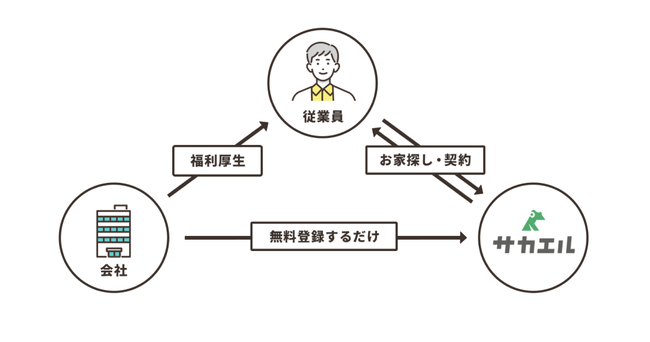 「サカエル」は完全無料で、従業員の不動産に関わる負担を低減する不動産福利厚生サービスです。導入企業に所属する従業員は、仲介手数料無料で物件の賃貸契約ができるほか、不動産売買時に掛かる仲介手数料を70%削減することができます。また、既に所属している従業員だけではなく、入社前の方(内定者)でも利用が可能です。さらに、「サカエル」の担当者が、物件賃貸の意向がある従業員と直接応対するため、導入企業の担当者の事務的な業務も一切発生しません。