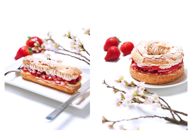 とちあいかとフランボワーズの果実感が華やぐパリブレスト。カスタードクリームの上にとちあいかのコンポートジュレをかけ、刻んだとちあいかの果肉とフワンボワーズ風味のチョコレートプレートを合わせました。チョコレートプレートのパリパリとした食感が心地よいアクセント。ホワイトチョコレートのクリームは、練乳とイチゴのピュレで味付けしています。