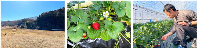 懐かしい里山の景色が広がる栃木県益子町。はっきりとした四季、ゆるやかな起伏の山、豊かな自然に恵まれた益子町では、その風土を生かしたイチゴ栽培が多く営まれています。
