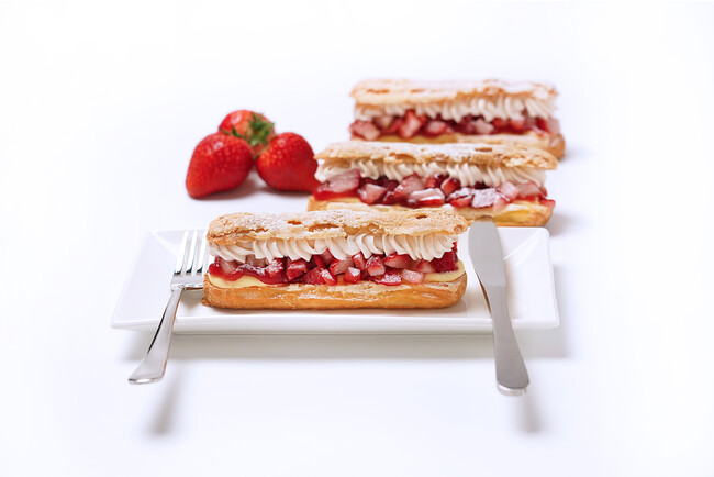 練乳といちごとホワイトチョコの組み合わせをお愉しみいただけるケーキのようなエクレア。カスタードクリームの上に、とちあいかのコンポートジュレ。練乳といちごのピュレを加えたホワイトチョコレートクリームで、刻んだとちあいかの果肉をふんわりサンドしました。ご自宅でイチゴ狩り気分をお愉しみください。