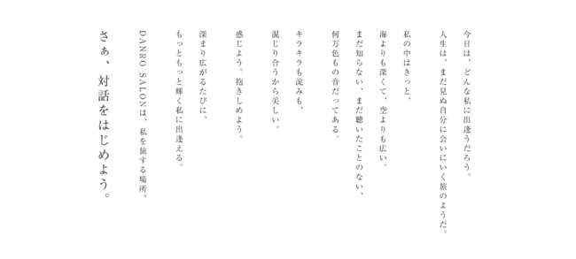 DANROのビジョンである「人生最高だなと感じられる、光輝く人で溢れる世界へ」を実現するために、スキルを学んだり加えたりするのではなく、自己探求やその場でうまれる人とのつながりを通して、人生の豊かさを高めていく機会を創出したいという思いから、DANRO SALONはうまれました。