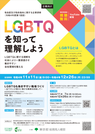 性自認及び性的指向に関する理解を社会により一層浸透させていくため、このたび、「LGBTQも働きやすい職場づくり」をテーマとして、民間企業、団体等を対象にオンライン研修を実施しますので、ぜひご視聴ください。(株式会社ツクルスは、本事業の運営業務を東京都から受託しています。)