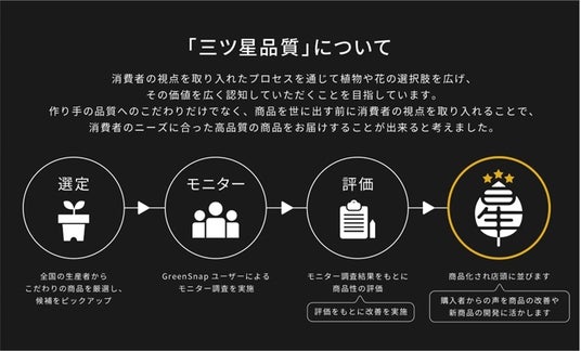 そこで、新たな展開手法として、オリジナルブランドとなる「三ツ星品質」を導入することで、消費者の視点を取り入れたプロセスを通じて植物や花の選択肢を広げ、その価値を広く認知していただくことを目指し取り組んでまいります。