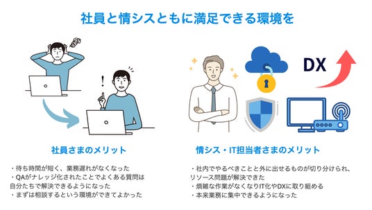 社内ITヘルプデスクサービスをアウトソースすることで、トラブル時の待ち時間が短く、業務が遅れずに済む、QAがナレッジ化されることで、簡単なものは自分たちで対応できるようになる、まずは相談するという環境ができるといったメリットがあります。また、情シスやIT担当者にとっては、煩雑な作業がなくなり、IT化やDXにも取り組めるようになる、本来業務に集中できるようになるといった利点があります。