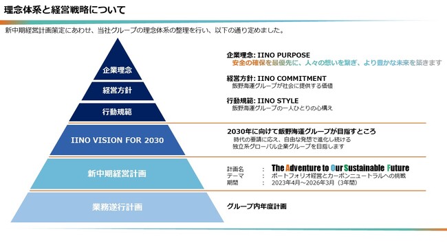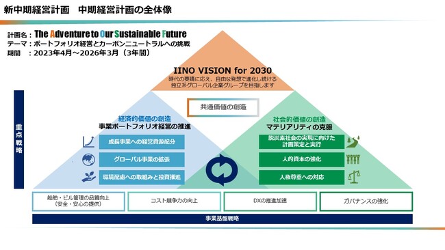 2020 年 5 月に発表した前中期経営計画「Be Unique and Innovative. : The Next Stage‐2030 年に向 けて‐」 (計画期間:2020 年 4 月~2023 年 3 月、以下「前計画」という) では、IINO VISION for 2030 とし て「時代の要請に応え、自由な発想で進化し続ける独立系グローバル企業を目指します」を目標に掲げ、グ ローバル事業の更なる推進や安定収益基盤の更なる盤石化といった経済的価値の向上に加え、サステナ ビリティへの積極的な取組みで社会的価値の創造も図り、当社グループの理解する共通価値を創造してい くことに注力しました。新型コロナウイルスの世界的な大流行やロシアによるウクライナ侵攻という歴史的な 転換点とも言える突発的なリスクが発生する中、計画で掲げた重点戦略の着実な実行に加え、海運業では 物流の混乱や変化によって市況が高騰したこともあり、最高益を 2 年連続で達成しました。