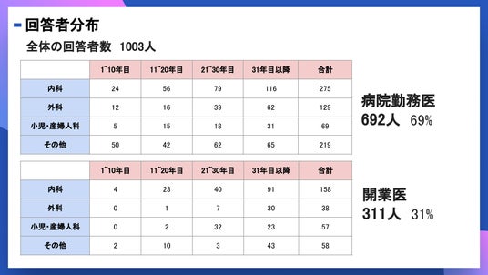 回答者数1003人の内、病院勤務医が69%(692/1003)、開業医が31%(311/1003)でした。