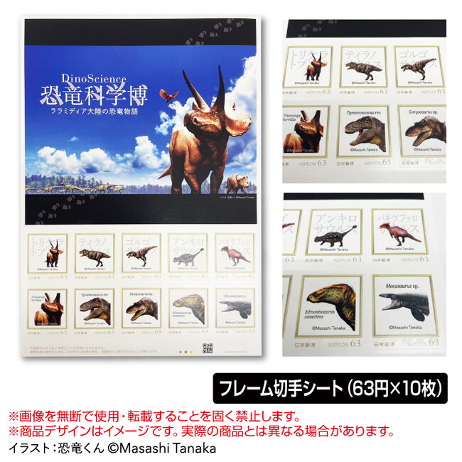 恐竜くんイラストにてデザインされたフレーム切手(63円切手×10枚)とシルバー箔押しが施された特製台紙付きの豪華仕様となってます。