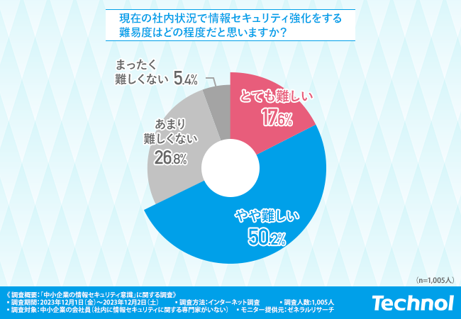 最後に、「現在の社内状況で情報セキュリティ強化をする難易度はどの程度だと思いますか」と質問したところ、『とても難しい(17.6%)』『やや難しい(50.2%)』と続きました。