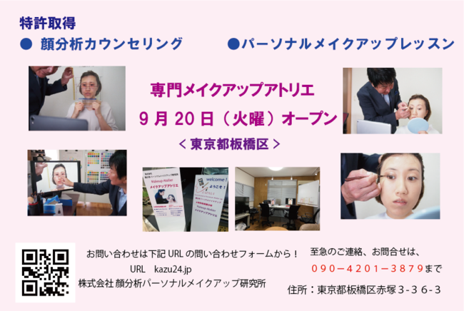 株式会社顔分析パーソナルメイクアップ研究所 (2016年9月設立) 代表カズ井上(井上和彦)は、特許取得の「顔分析新バランス基準」「顔分析フィルム」を用いた唯一無二の『顔分析カウンセリング』と『パーソナルメイクアップレッスン』のサービスを専門に行うメイクアップアトリエ(東京都板橋区)を開設し、9月20日(火)よりサービスをスタートしています。