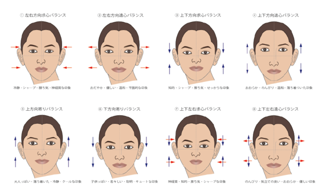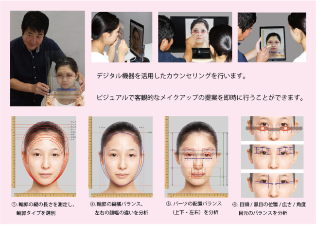 顔分析カウンセリングは、特許を取得した独自の分析ツール「顔分析フィルム」(特許認定)と、デジタル機器を活用し、顔型(輪郭)の大きさ・縦横のバランス・形状や、各パーツ(眉・目・鼻・唇)の配置・角度・形状を、客観的にビジュアル(画像)で基準との比較を見ていただき、ご自分の顔の特徴、個性を把握してもらうことができます。