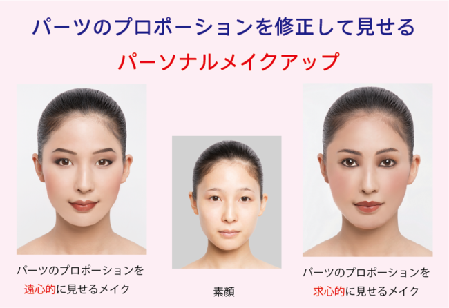 そして、基準との差を埋めるようパーソナルメイクアップのデザインを提案します。メイクアップはレッスン形式で行い、おうちに帰られてから復習できるよう、スマホでの動画撮影もしていただけます。また、プロポーション修整のメイクだけでなく、イメージ表現のためのパーソナルメイクアップもご教示させていただきます。顔分析画像、メイクアップのビフォーアフター画像などはすべてご本人にメールでお渡しします。