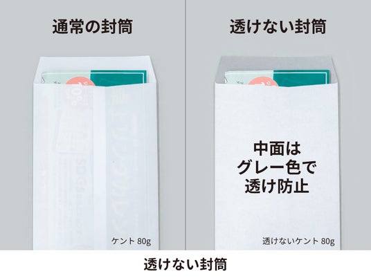 封筒の中面がグレー色の特殊加工が施されていることで、内容物が透けるのを防ぎます。請求書や履歴書、チケットなど重要書類の情報を守ります。不透明度99%なので、白でも淡い色でも透ける心配がありません。