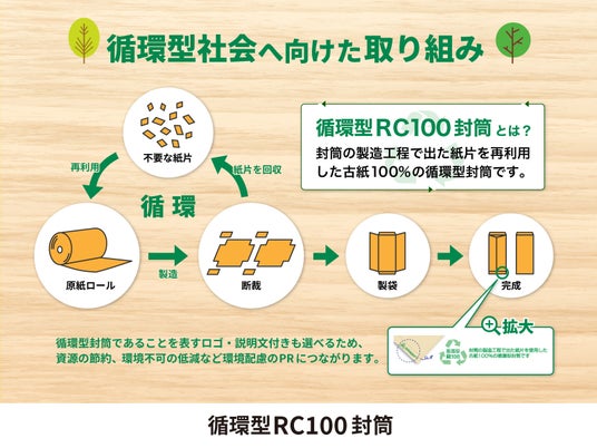 封筒の製造工程で出た切れ端の紙片を再利用してできた封筒です。紙の循環を考えた古紙パルプ100%配合であり、封筒裏面の右隅にオリジナルのロゴ・説明文付き/なしを選べ、環境配慮への取り組みにつながります。