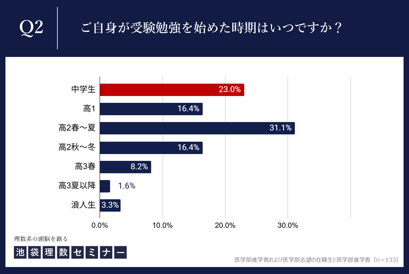 一方で、「ご自身が受験勉強を始めた時期はいつですか?」という質問では、最も多かった回答が「高校2年生春~夏」で31.1%、次いで「中学生」が23.0%という結果になりました。