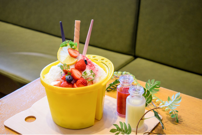森に見立てた牛乳氷にはたっぷりと自家製練乳を使用し、大きめにカットしたフルーツや具材を散りばめた贅沢な牛乳かき氷。かき氷の中には自家製のレモン寒天やコーンフレークスポンジなどを忍ばせ、食べ進めると感じる【食べる楽しさ】を体験して頂けます。