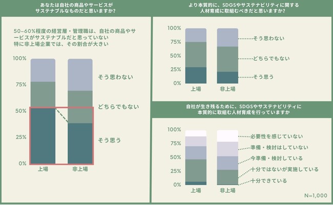 「自社の商品やサービスがサステナブルなものだと思いますか?」という質問に対して、50%~60%の経営層・管理職は「どちらでもない」または「そう思わない」と回答し、特に非上場企業では自社の商品やサービスがサステナブルだと思う割合が小さくなりました。