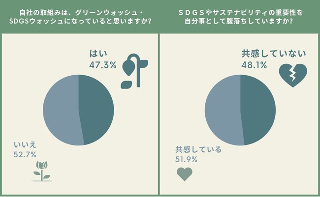インターネット調査に回答した経営層・管理職のうち、47%が「自社の取り組みはグリーンウォッシュ・SDGsウォッシュになっていると感じている」と回答。また、48%は「SDGsやサステナビリティの重要性に共感していない」と答え、SDGsを理解し本質的に取り組むことに前向きな経営層・管理層は全体の約半分という結果になりました。
