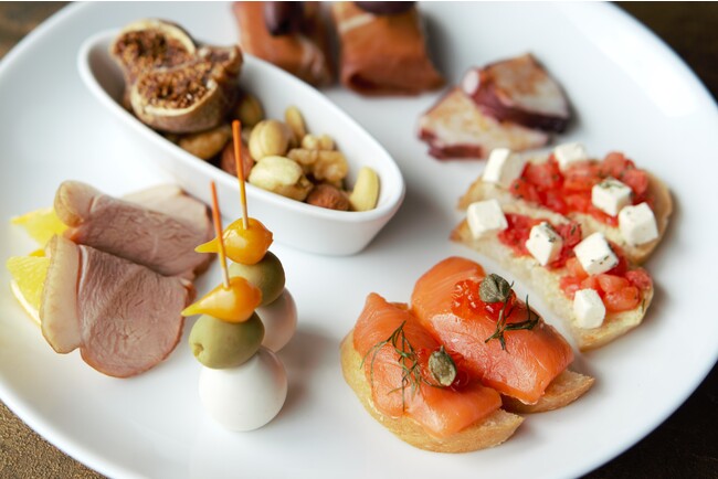 〈セイボリー〉鴨のスモークとオレンジ、うずら卵のピンチョス、生ハムのピンチョス、サーモンのカナッペ、トマトのブルスケッタ、タコのパプリカマリネ、ミックスナッツ・ドライいちじく